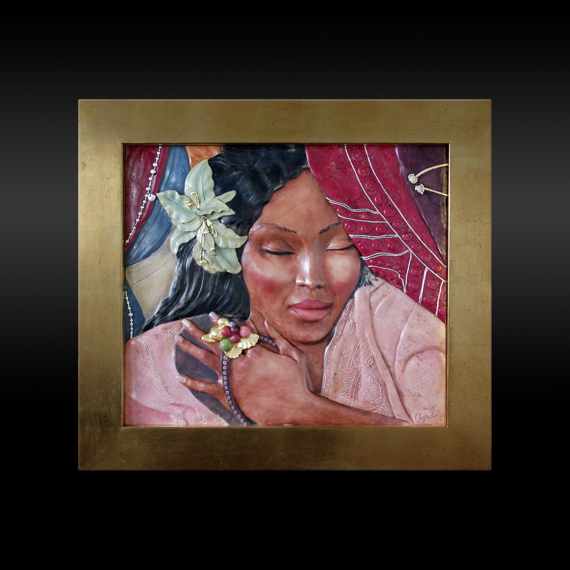 Creo que empezaré por deciros que la inspiración vino de una foto de publicidad en la que aparecía Naomi Campbell con una sandalia en una mano, ya no recuerdo cual era el anuncio , solo que mi hermano Jorge me trajo la foto y nos encantó , en ese momento pensamos que de ahí podíamos sacar algo. Mi Enrique en cambio nos decía que no lo veía muy claro pero que adelante a ver que sacábamos. Decidimos el formato y el tamaño y empecé el modelado , por aquel entonces había estado haciendo la colección de las Tahitianas de Gauguin y quizás por ese motivo lo que fui realizando daba un aire a el trabajo de Gauguin aunque lo que estaba realizando era una interpretación muy personal de aquella fotografía de moda aparecida en una revista. El resultado final del modelado nos gustó mucho, esa vez ya no hubo demasiadas criticas , aunque como nos exigimos mucho siempre pensamos que hay cosas mejorables , pero no teníamos ni idea de cómo podría encajar en el público. Le hicimos un marco dorado sencillo y lo presentamos por primera vez en la Feria del Mueble de Madrid en Abril, la presentación del trabajo fue todo un éxito a todo el mundo le encantó y fue un éxito de ventas desde entonces hasta ahora. Espero que os guste tanto como a mi que puse toda mi pasión y empeño al crearla. Puedes ver o adquirir el cuadro en relieve "África" en este enlace